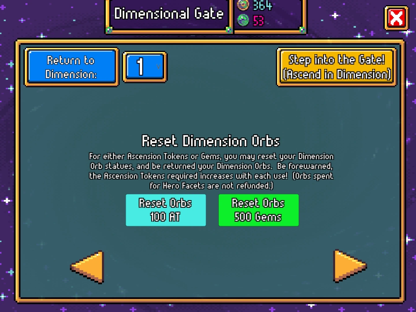 This option allows players to reset their Dimension Orb statues, returning their obtained Dimension Orbs. It costs either 100 Ascension Tokens or 500 gems to reset the orbs. 3 Dimension Orbs spent to unlock Hero Facet, however, cannot be reclaimed.