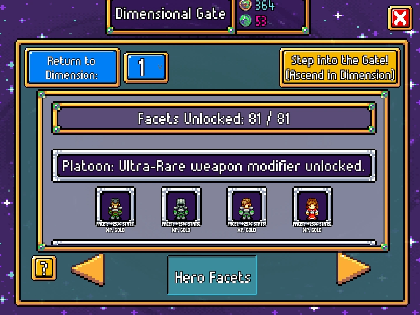 Hero Facet costs a permanent 3 Dimension Orbs to unlock. It consists of various solo hero challenges. Completing each run grants various Perks and benefits.