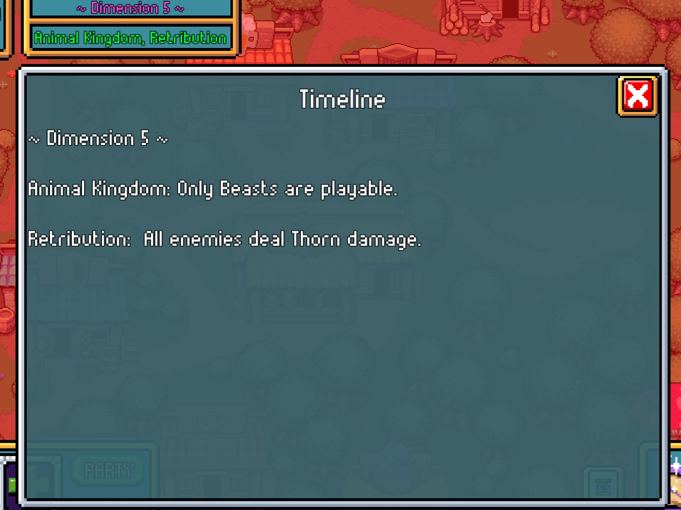 Dimensions are part of the progression of the game. Each new Dimension determines the difficulty of the general gameplay loop. The information of currently active Dimension and alternate Timeline can be seen on the top of the main screen.