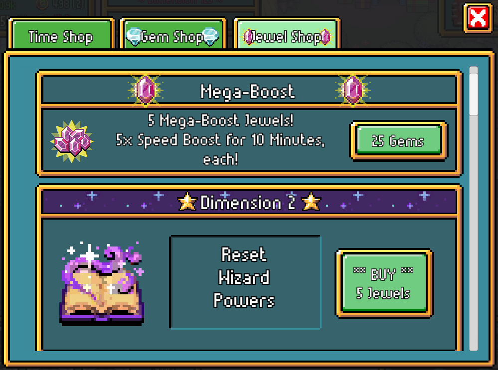 | Reset Wizard Powers | In-game feature | D2 | 5 Jewels | Allows players to reset their currently assigned Wizard Powers Levels and XP. |