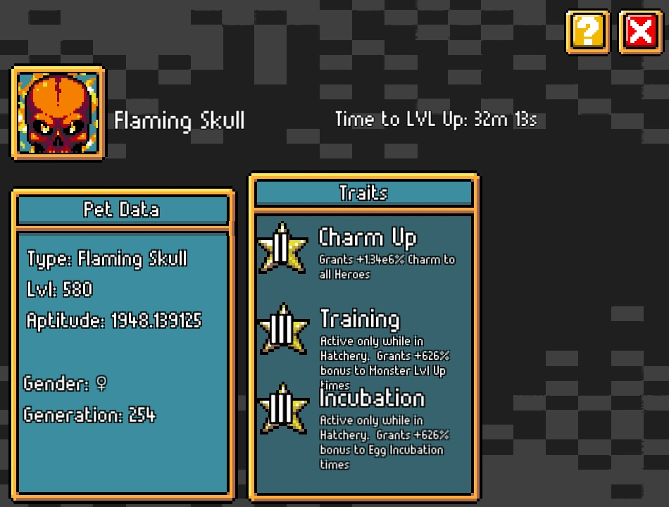 - Level: Determines the current pet's growth. Level can only be raised by letting the pets rest in the Hatchery. Level's growth is not linear, as the power increase will diminish each Level.