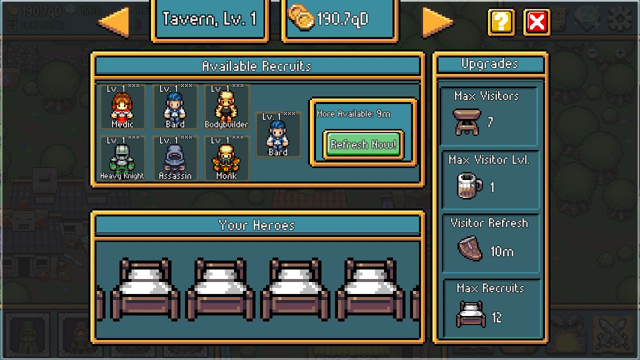 Recruitment buildings are unlocked as player progresses throughout the game, with the tavern being available from start. Each of these buildings can be upgraded for following bonuses: