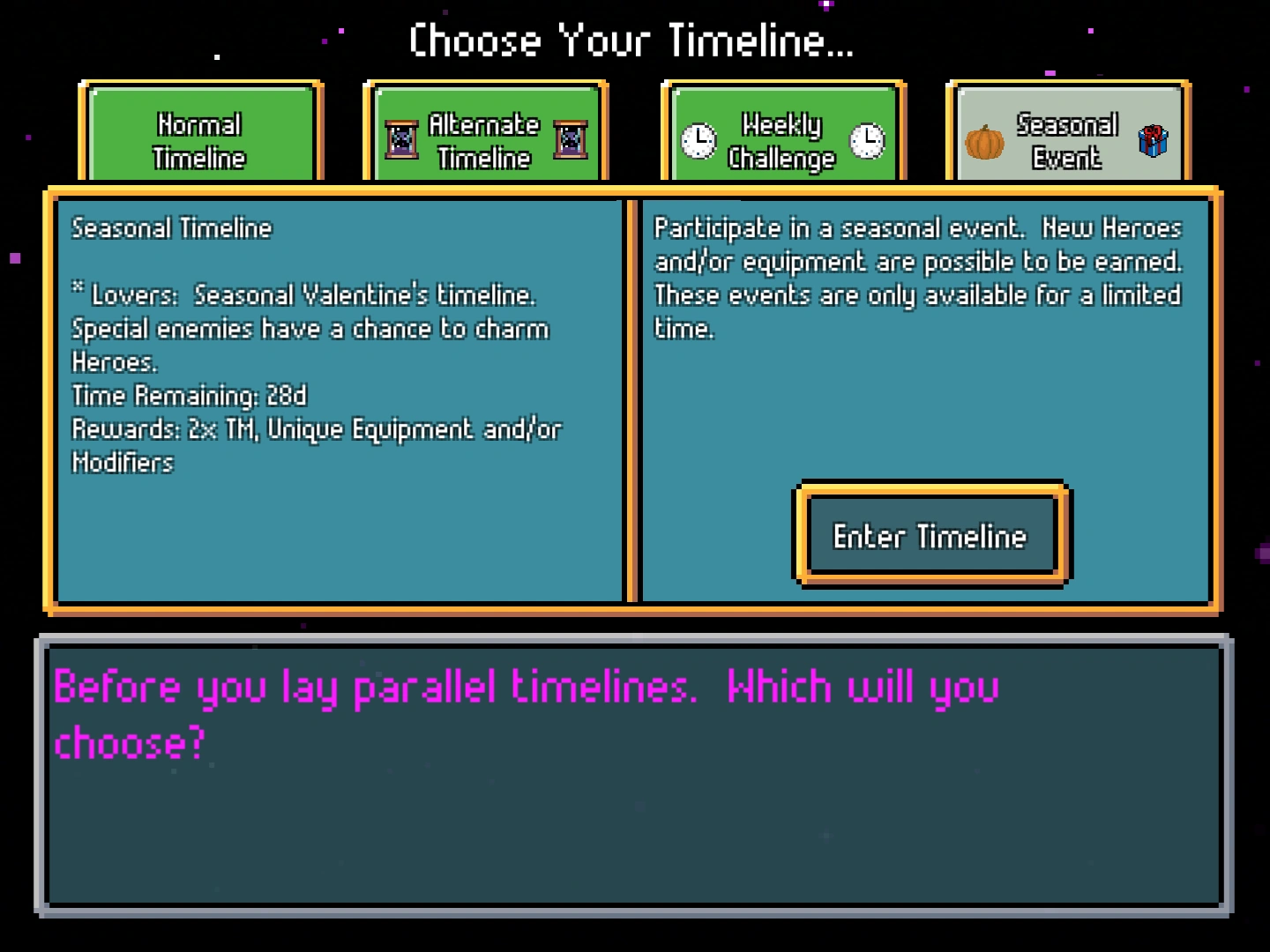 This timeline comes with the new enemy, the Love Slime, which drops the event currency called “Hearts” that can be used to purchase various items in the Event Shop. The Event Shop offers one hero, Angel, a unique weapon and accessory. Additionally, the Love Slime have a chance to drop another type of timeline-exclusive pet’s eggs.