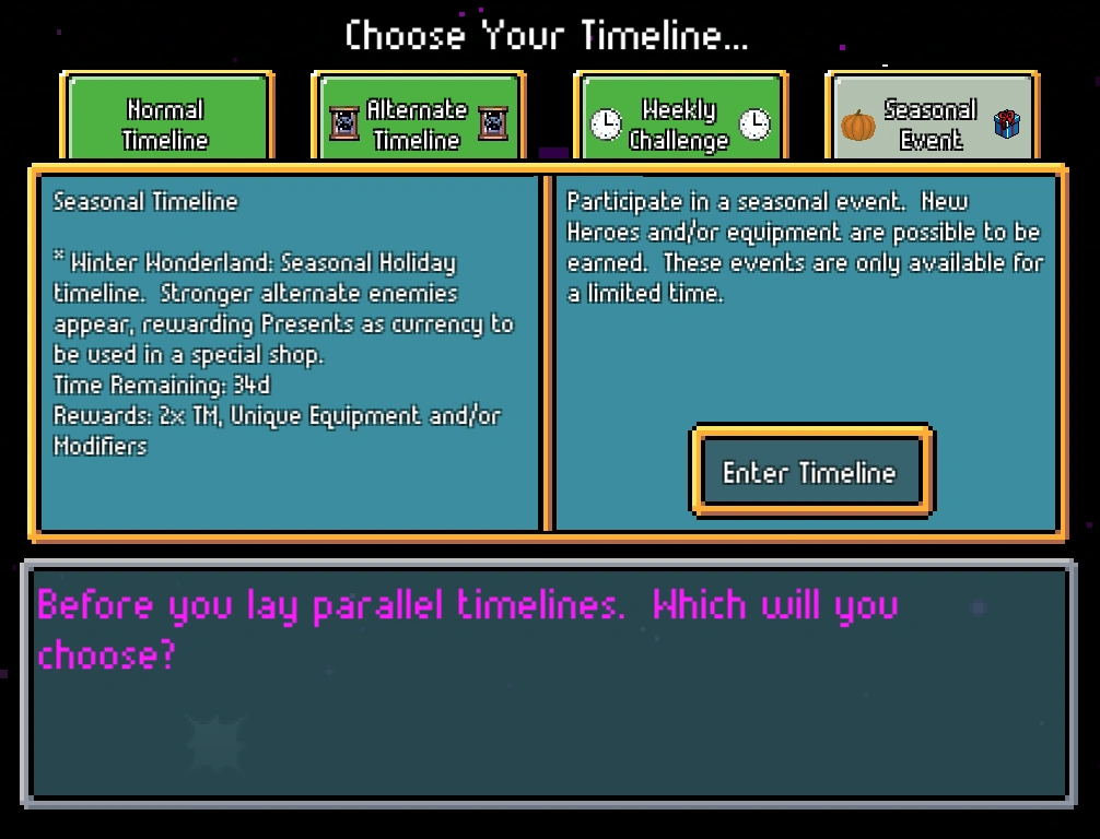 The Winter Seasonal Timeline is one of the temporary event timelines. It is available 27th November - 31st December and can be accessed via a separated timeline tab on the time warp screen, thus cannot be combined with any other timelines.