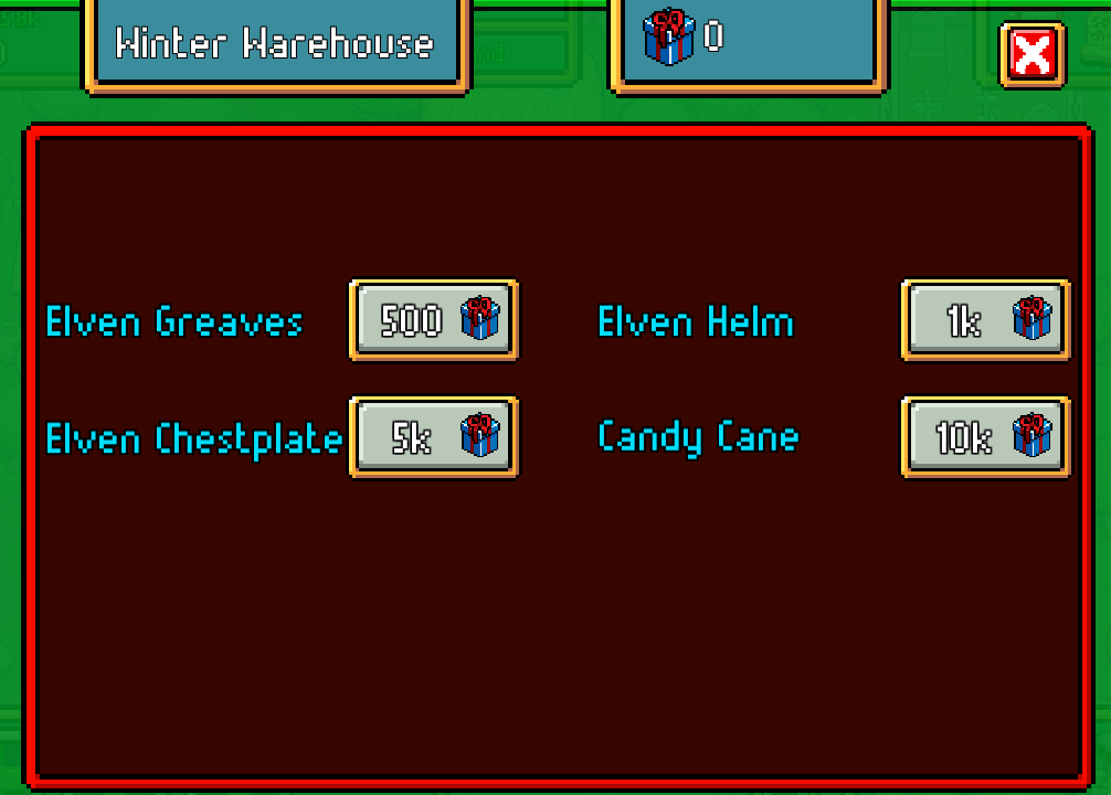 The Event Shop in this event is called "Winter Warehouse". The shop is located near the Storage building, in the shape of an igloo.